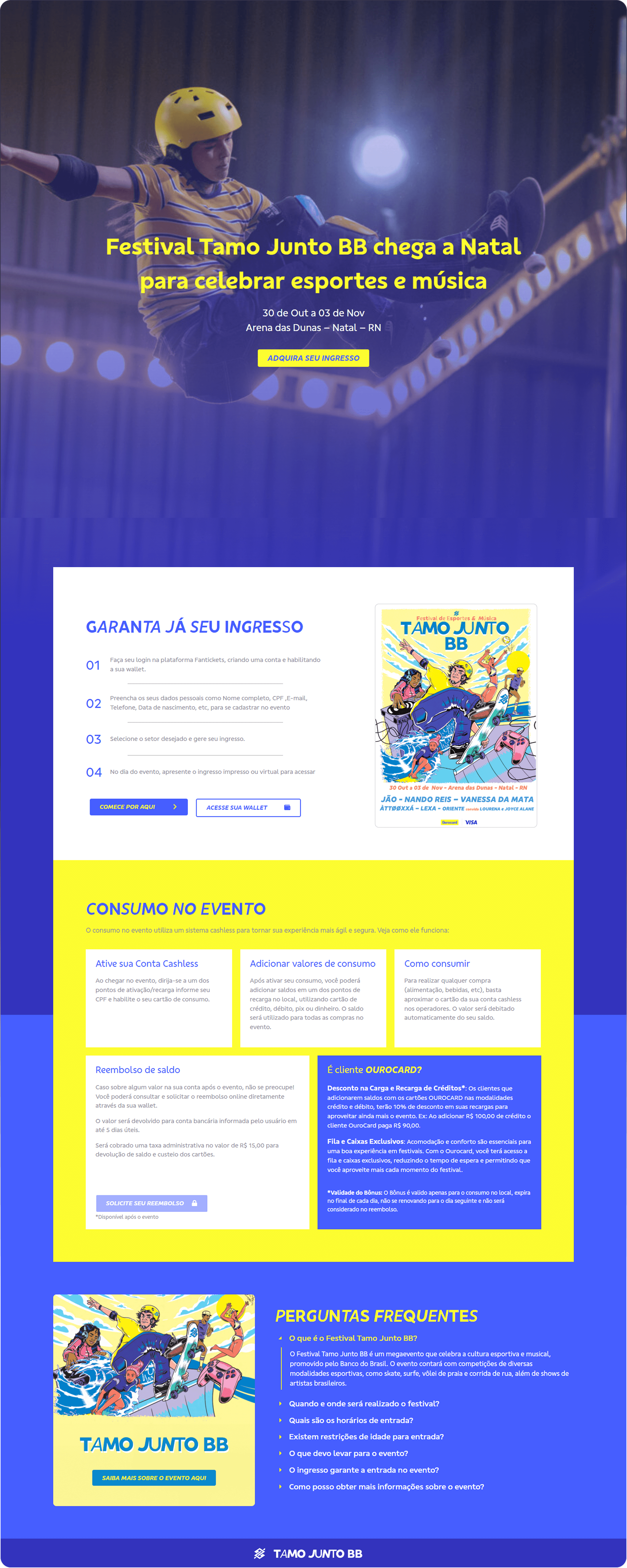 The project consisted of developing the landing page for Tamo Junto BB, a cultural event promoted by Banco do Brasil. The page was structured with a focus on user experience, clearly and engagingly highlighting all essential information: date, location, attractions, registration flow, on-site consumption, and cashless reimbursement. The design was conceived to be modern, responsive, and functional, ensuring intuitive navigation on any device.